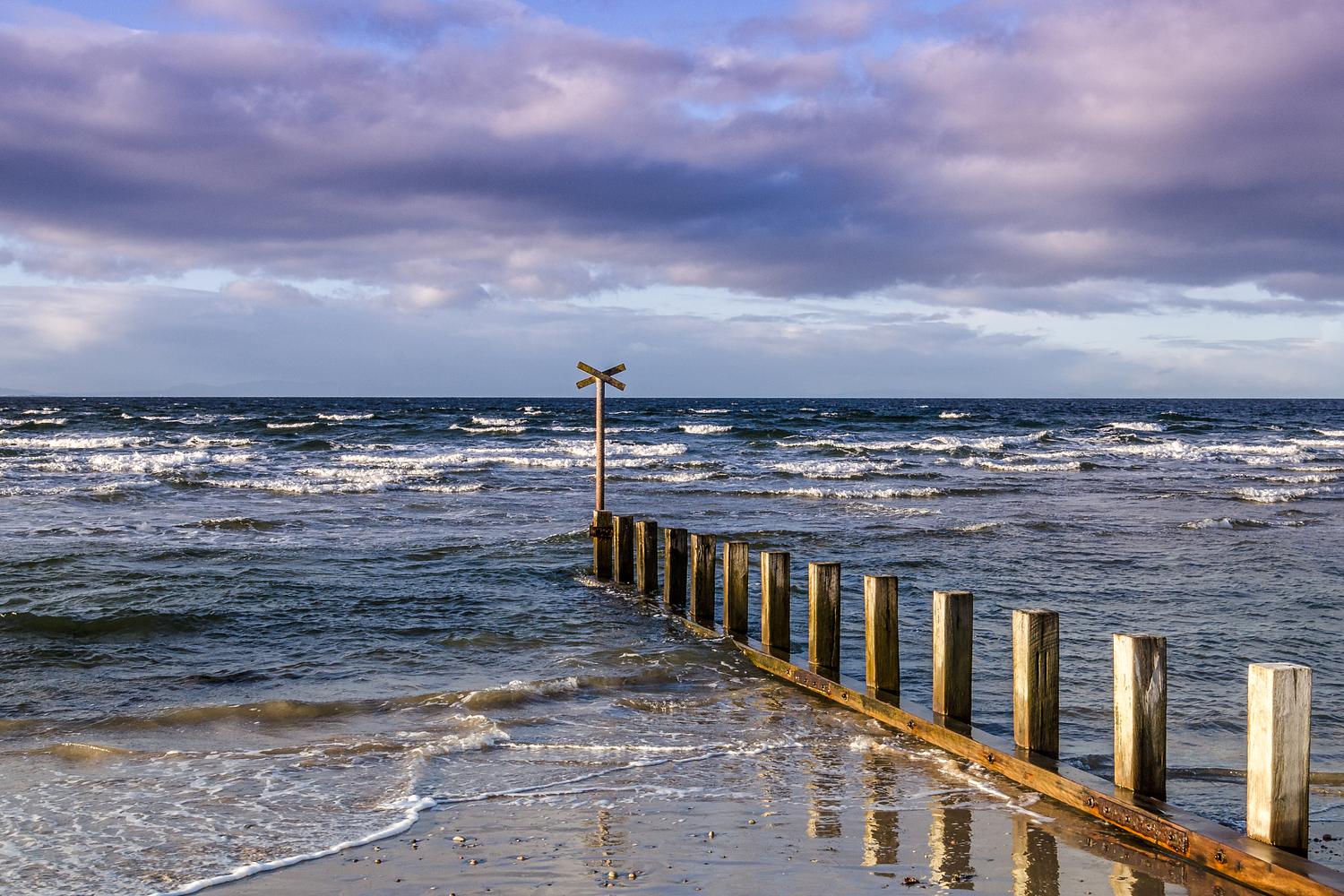 Quite a calm but still biting autumn day at Findhorn in Scotland at a sea break in the late afternoon light. Gorgeous.