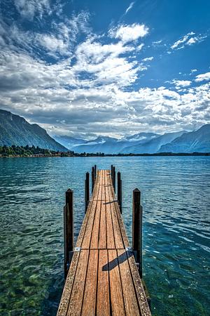 A lone jetty juts out into the far end of Lake Geneva, Switzerland, inviting that familiar temptation to launch yourself off the end of it into the cool waters beyond. What a stunning place for a swim.